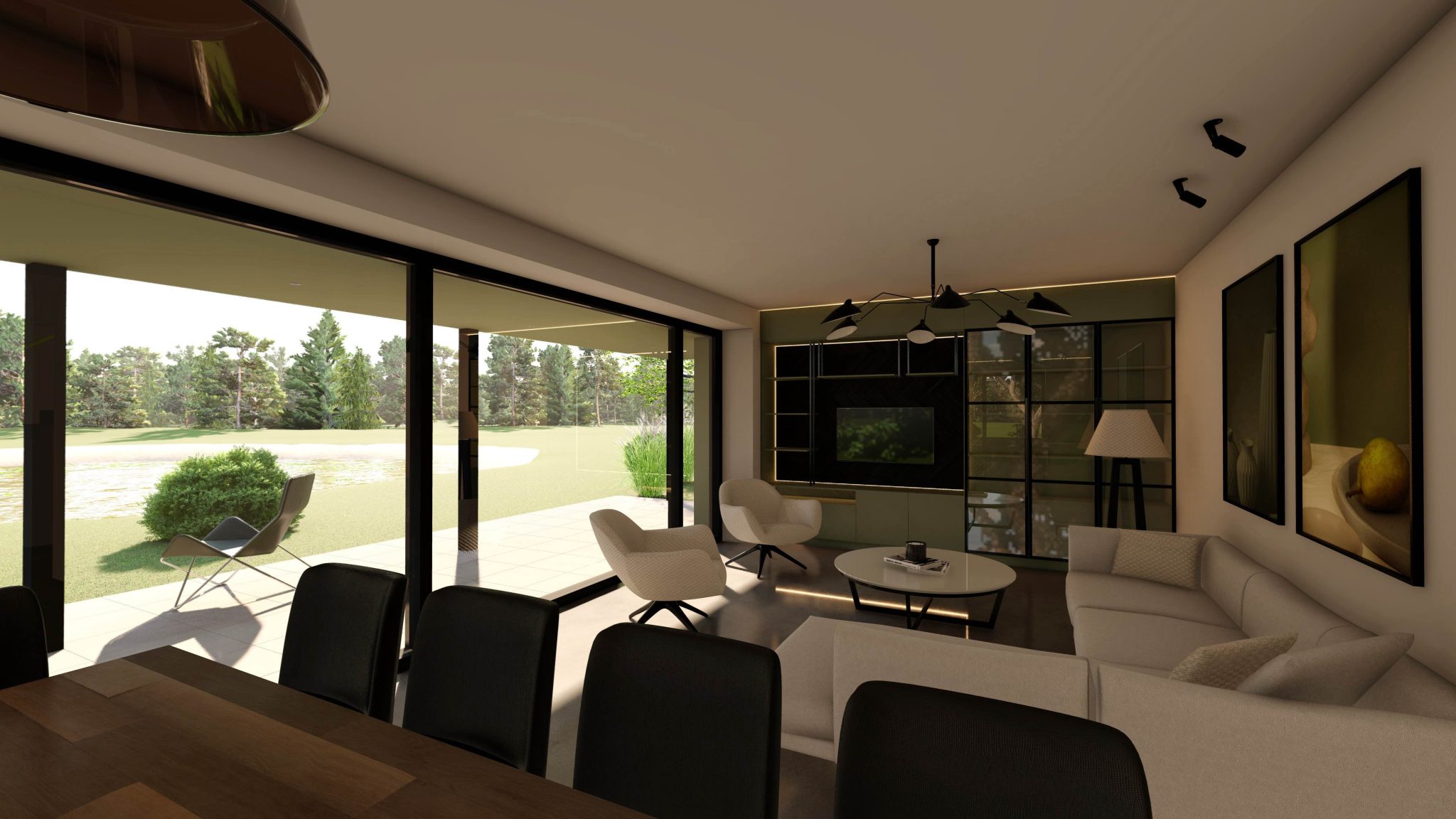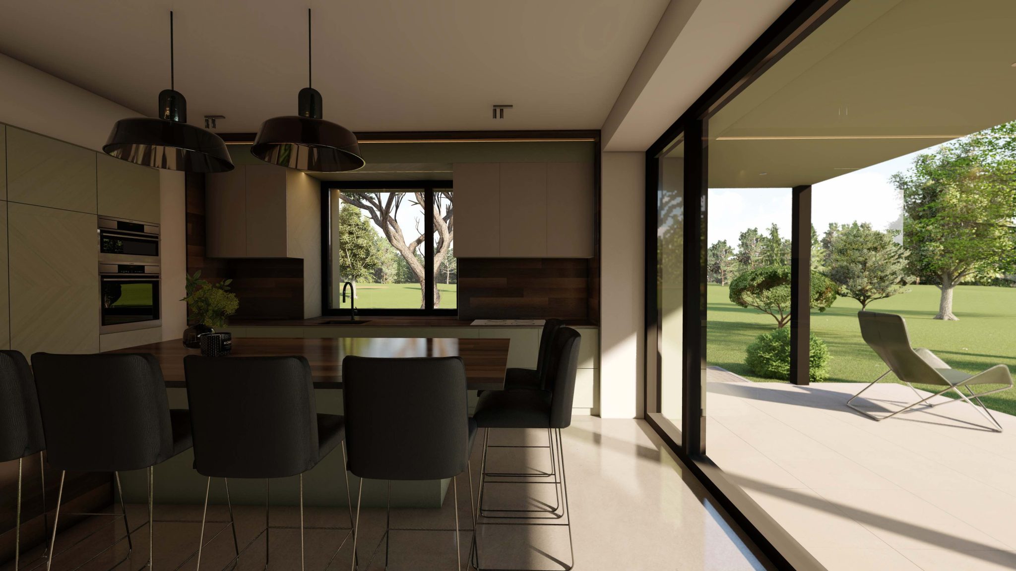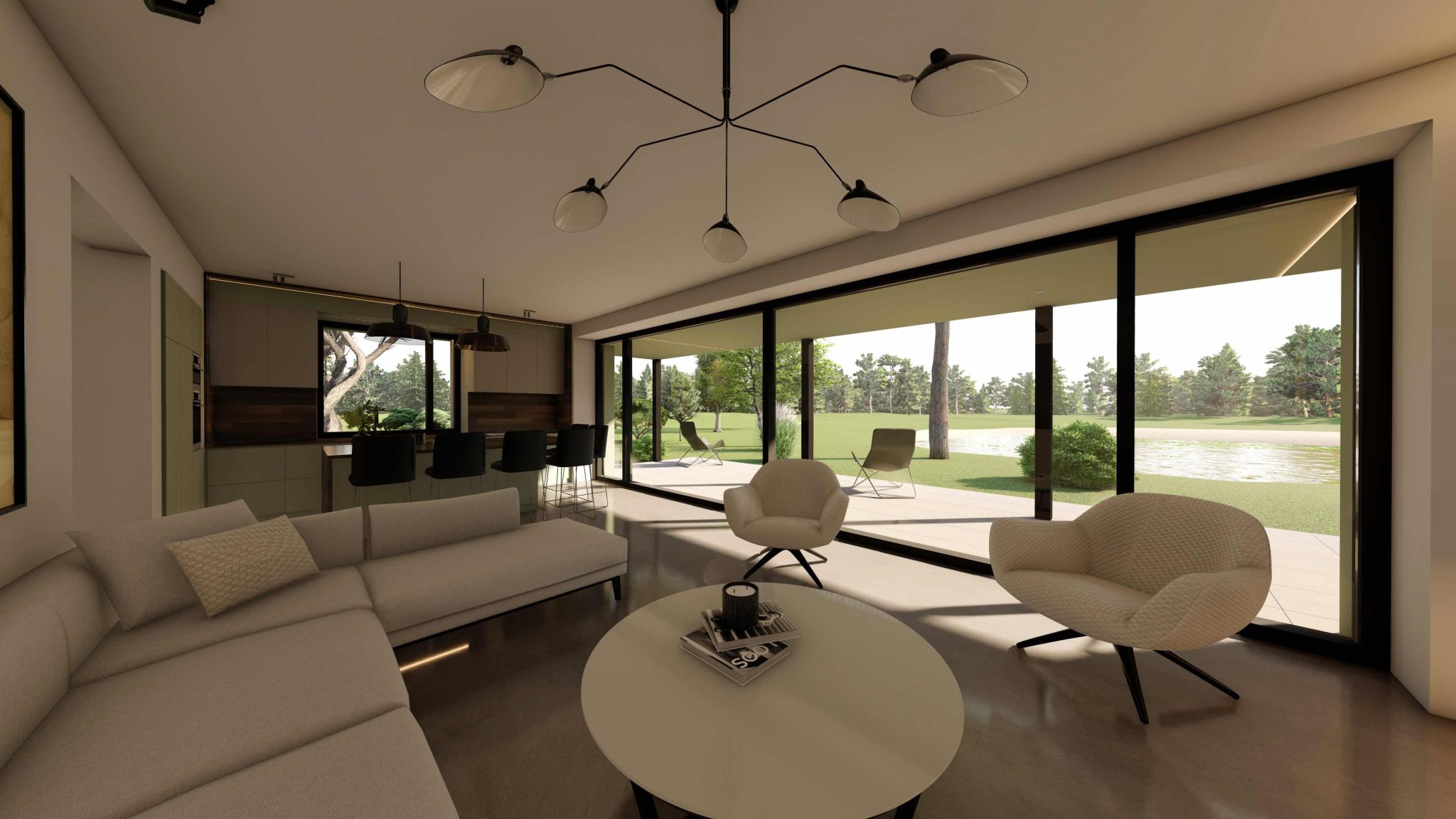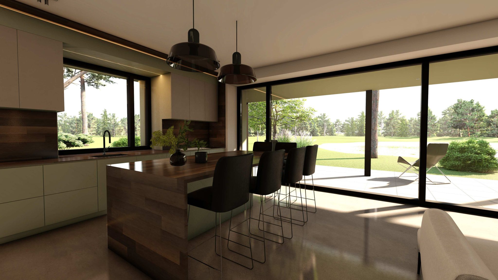 1.stāvā atrodas plaša dzīvojamā istaba un virtuve ar ērtu darba virsmu, ietilpīgiem skapjiem un augstas klases virtuves iekārtām. Pa logu virs virtuves darba virsmas iespīd rīta saule, bet plašie stiklojumi nodrošina saikni ar dabu un segtu terasi, kā arī kontrolētu saules gaismu visas dienas garumā. 1.stāvā izvietots arī funkcionāls ieejas mezgls ar iebūvētiem skapjiem, sanmezgls ar dušu un tehniskā telpa.